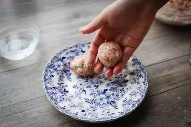 3、将搅拌后的肉碎在两掌之间揉成球状、成型后放入碟子中。