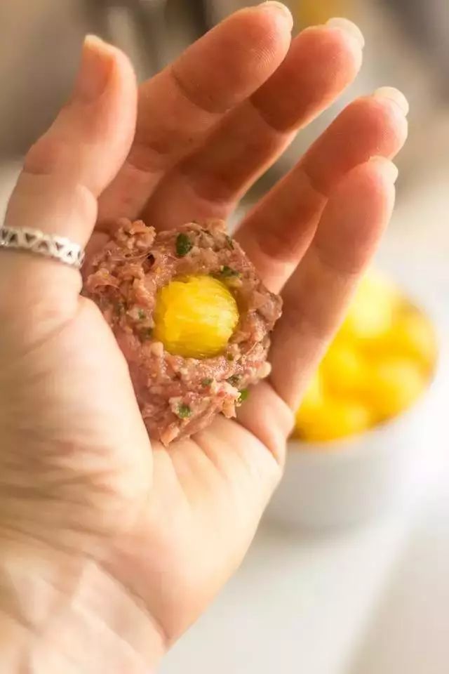 3、将菠萝至于肉的中心,用肉包裹起来,捏成球状。