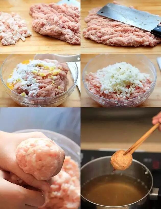 材料:碎猪肉300g、食用油40g(用于煎肉丸);