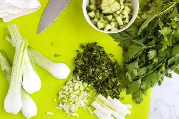 1、将调料葱、蒜、芹菜、黄瓜切断、切碎。
