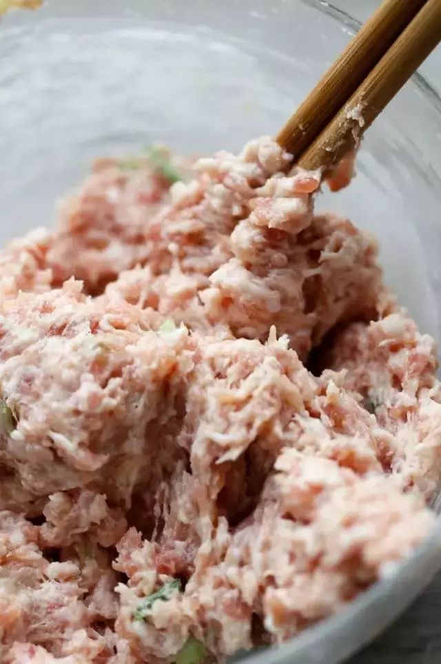 2、将切碎的肉与调料沿一个方向搅拌均匀。
