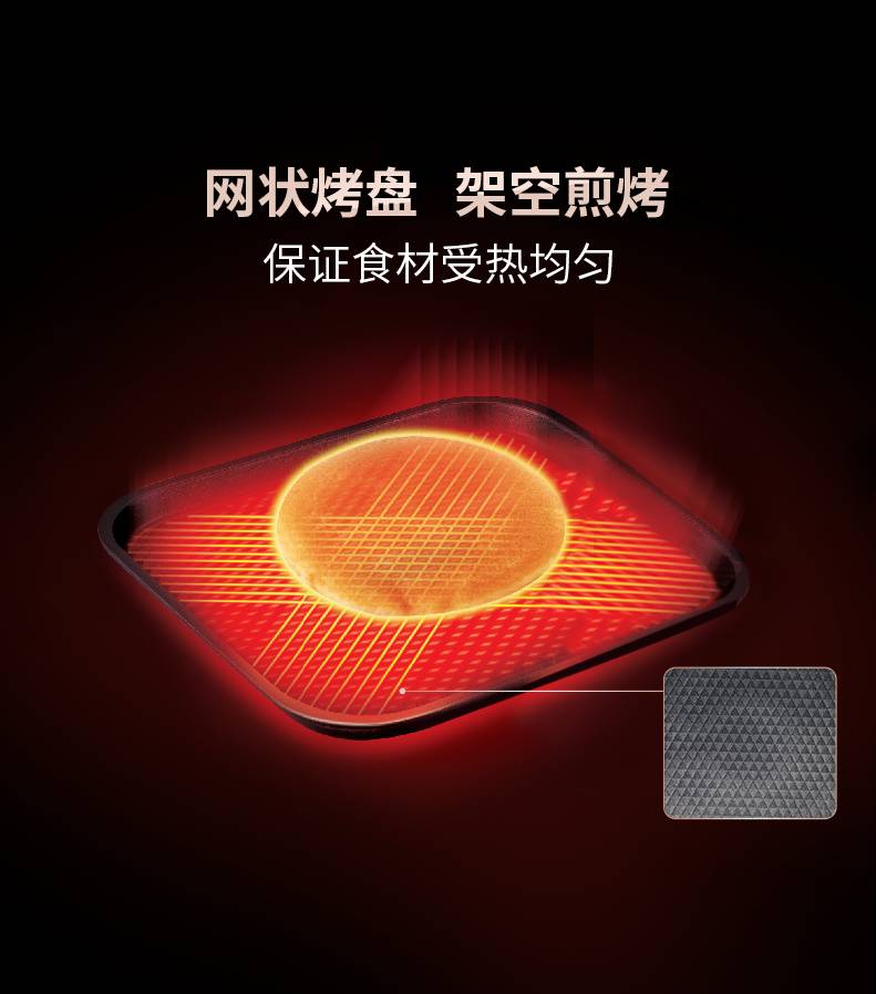 而且它的网状分布烤盘,能够架空煎烤,保证烹饪时温度均匀,激发食物最佳状态,让你胃口大开。
