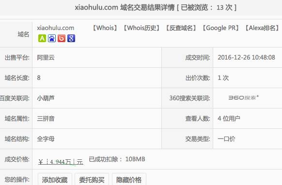 买家名下只有xiaohulu.com和xiaoquan.com两个域名,应该是终端客户。再联想一下“小圈”和“小葫芦”,都是“小”字辈,应该是这家公司买来做新产品的。至于这个小葫芦到底卖什么药?目前还不知道。