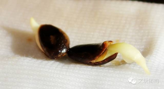 3. 然后用40℃的温水浸泡12~24小时,(我一般把水和种子放入一个小保温杯里一天)捞出后用湿纱布包好甩干,并嗑开浸好的葫芦种子,便于出芽。用方形盘子、碗均可,底下垫上一层纱布放上种子,将浸好的种子均匀地放在纱布上,上面盖上拧干的新毛巾,放到泡沫箱子里,泡沫箱子口绷上塑料布催芽,一般一周左右出芽,温度30~35℃;