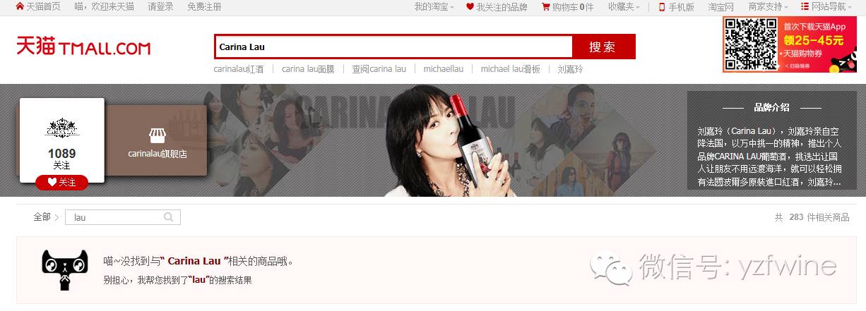 在天猫里搜刘嘉玲的天猫旗舰店Carina Lau,显示的结果是……