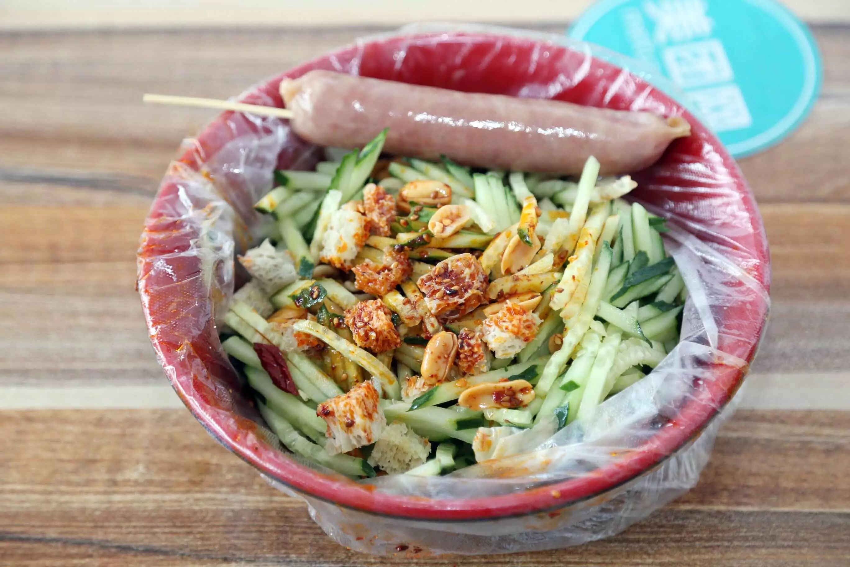 在淮安开了很多年的凉皮面店,知名度很高,价格还是很实惠的,食材都很新鲜。凉皮七元一份,软软的却不失筋道,份量还是比较足的。满满一碗配上一根烤肠,夏日的标配!