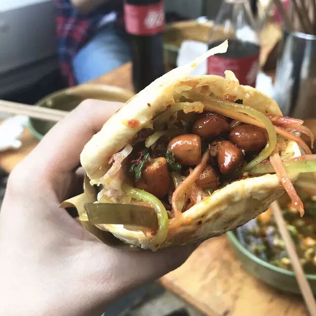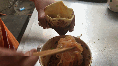筷子顺着饼口一撑,能马上听到如脆纸般的声音,挑起拌菜就往饼里灌,直到塞满,一个胖嘟嘟,爆开合不了口的南充锅盔就递到了你面前。