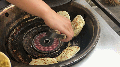说着她熟练的捏面,擀面,白面热锅无油一煎,打下一个,边打边在锅上用手翻上一个,待一个打好,左手抽锅,右手持夹,左手回抽,右手前伸把锅盔放入烤炉,再快速反转炉边已鼓的饼皮,行云流水。