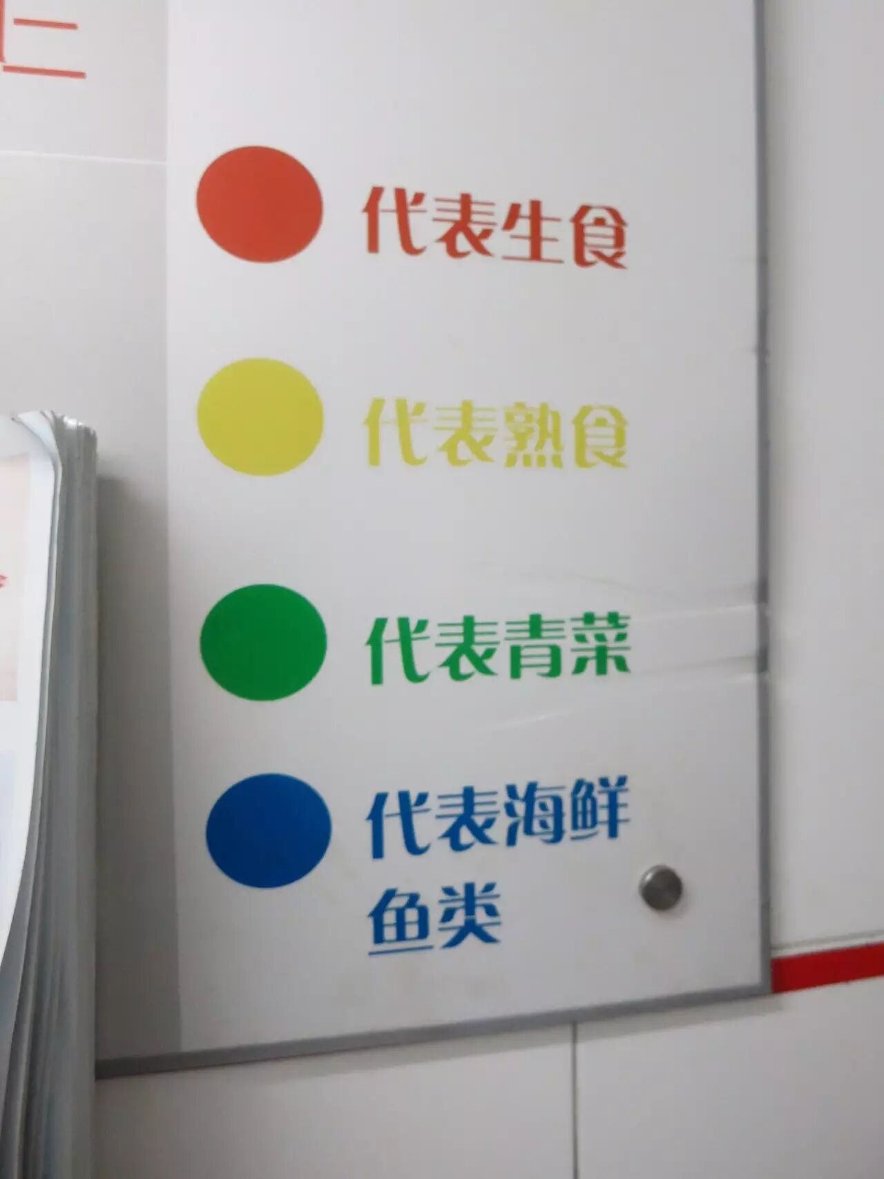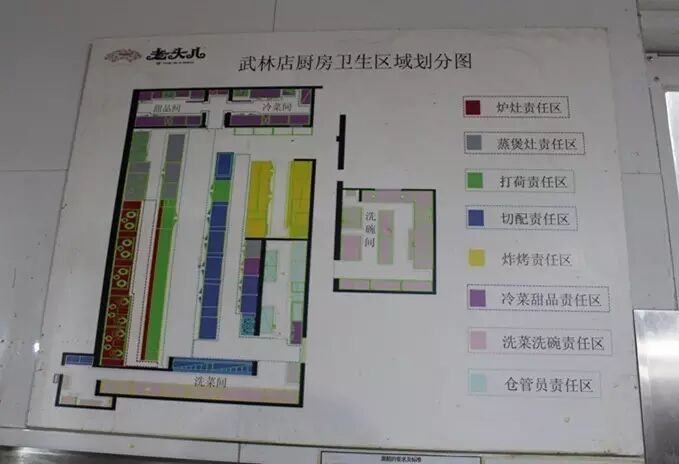 杭州老头儿油爆虾餐厅,改变了卫生区用标号划分的办法,用颜色标注厨房各个卫生区,并在右侧注明各种颜色对应的档口,一目了然。