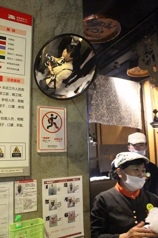 在长沙食在不一样餐厅,为了提高空间利用率,最大限度地增加营业面积,厨房和过道被设计得极小,因为餐厅生意火爆,高峰期连接前厅与后厨的过道里都是端着菜疾步快走的员工,为了避免在转弯处发生碰撞,餐厅特意采购了一批小号的“拐角镜”,让员工不到转弯处,就能看到令一侧的“交通”状况,非常方便。