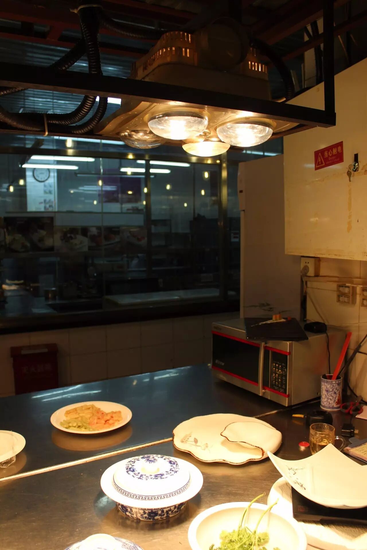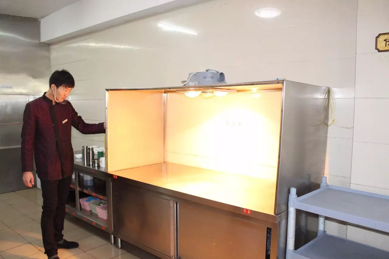 同样把浴霸搬进厨房的,还有青岛腾飞喜庆大酒店,传菜部特制了一个加装浴霸的保温箱,服务生上菜之前,菜品要在这里完成分拣、划单等步骤。高峰期时,即便菜品短时间内没法上桌,也能保证热度。