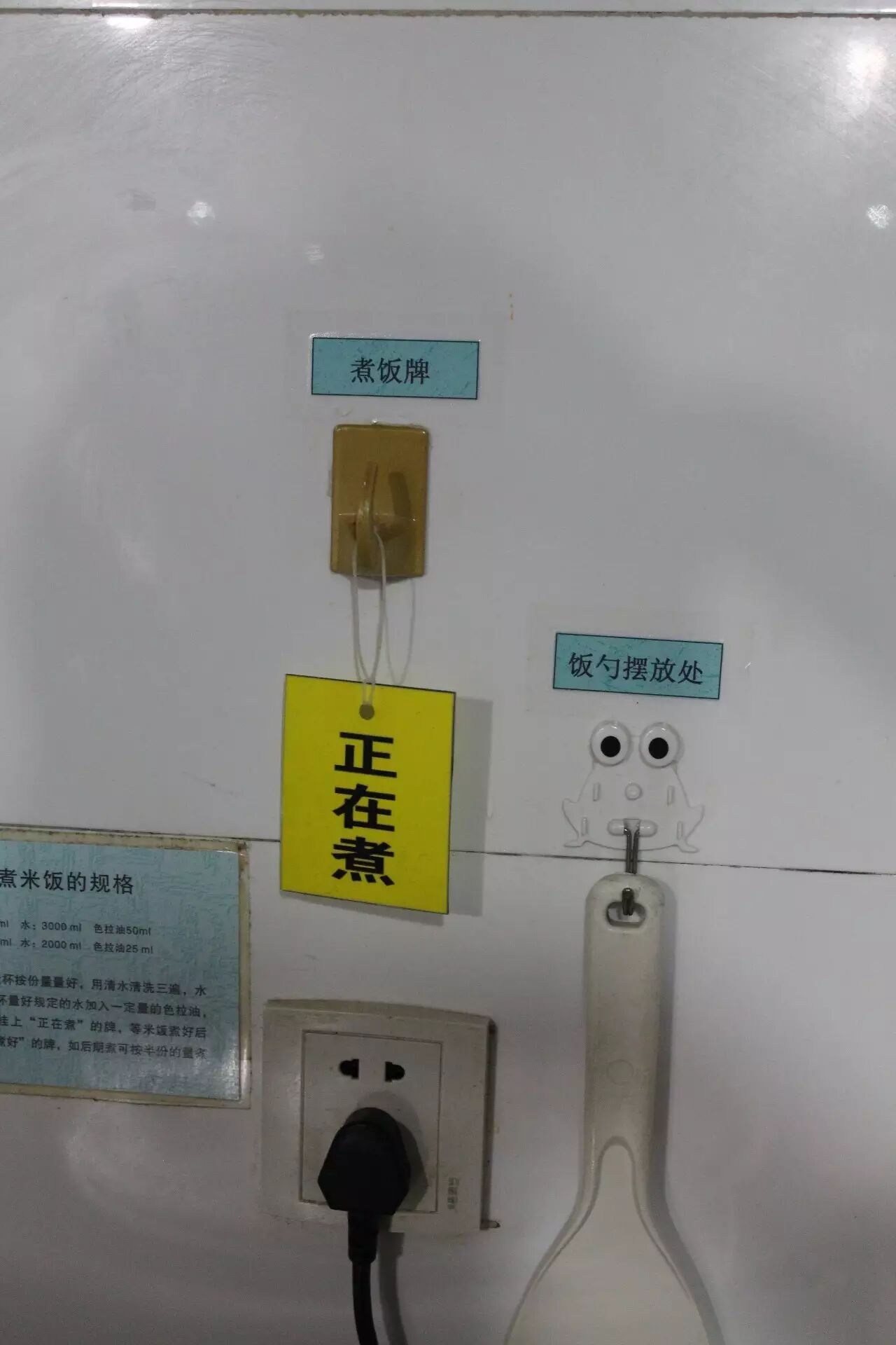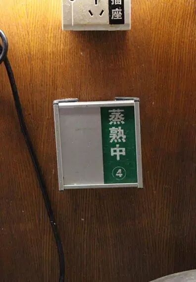 铝合金框内放着黄、绿双拼的卡片,黄色一侧写着“已煮熟”,绿色一侧写着“蒸熟中”,外面有一张可以左右滑动的挡板,滑到左侧,漏出右侧,即可清晰地显示这煲米饭的成熟状态。