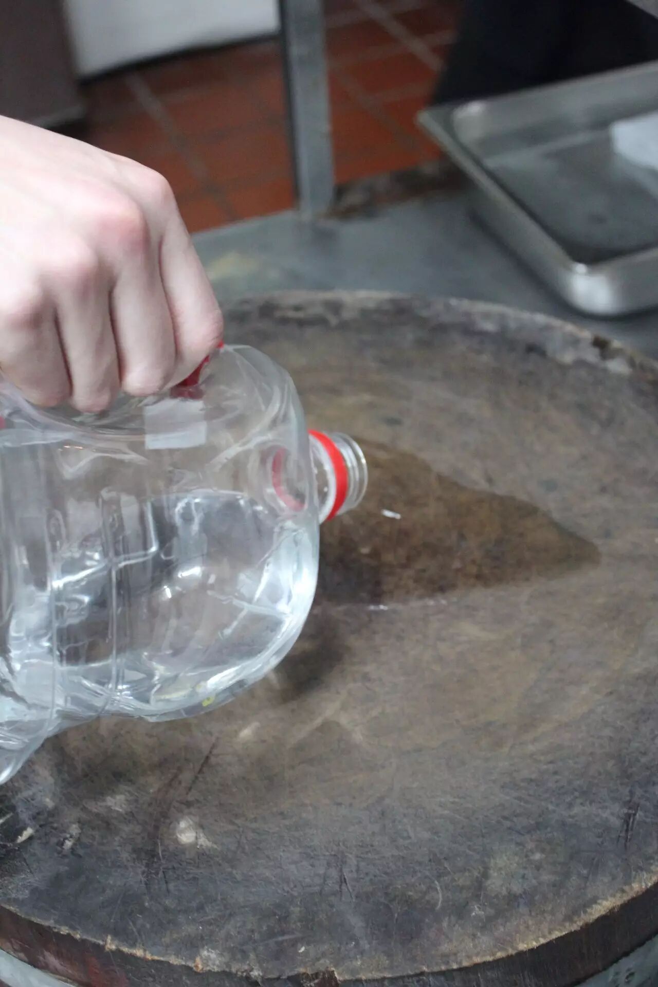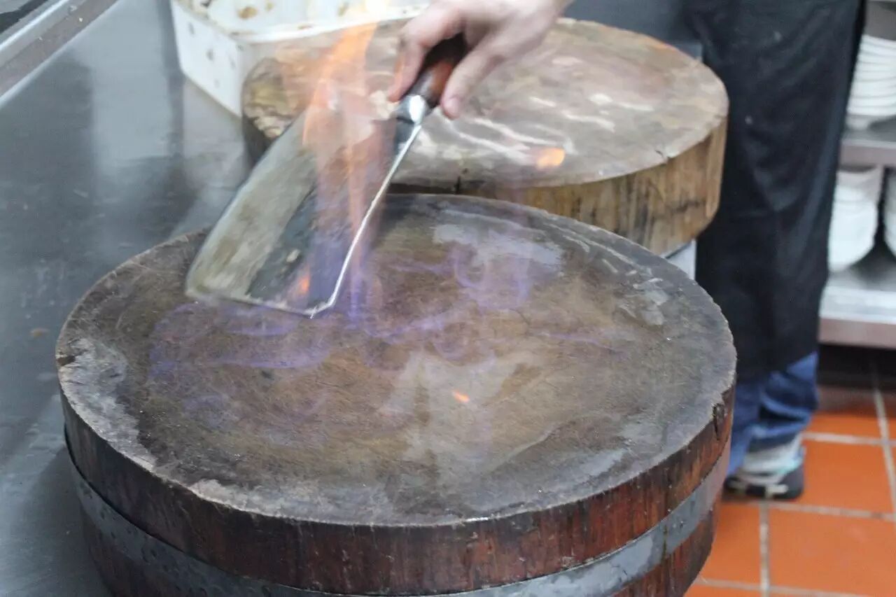 点燃后用菜刀反复刮板面,避免酒精在低洼处聚集将砧板烧坏,又能同时给菜刀消毒。