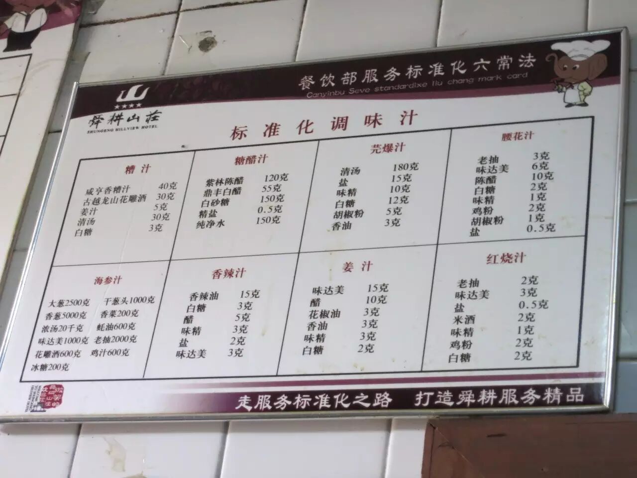 济南舜耕山庄多年来一直探索鲁菜标准化出品,将各种常用酱汁及调料配制方法张贴在厨房中,同时,还专门设置了酱汁柜,既能提升走菜速度,又避免因为慌乱造成的口味不稳定。