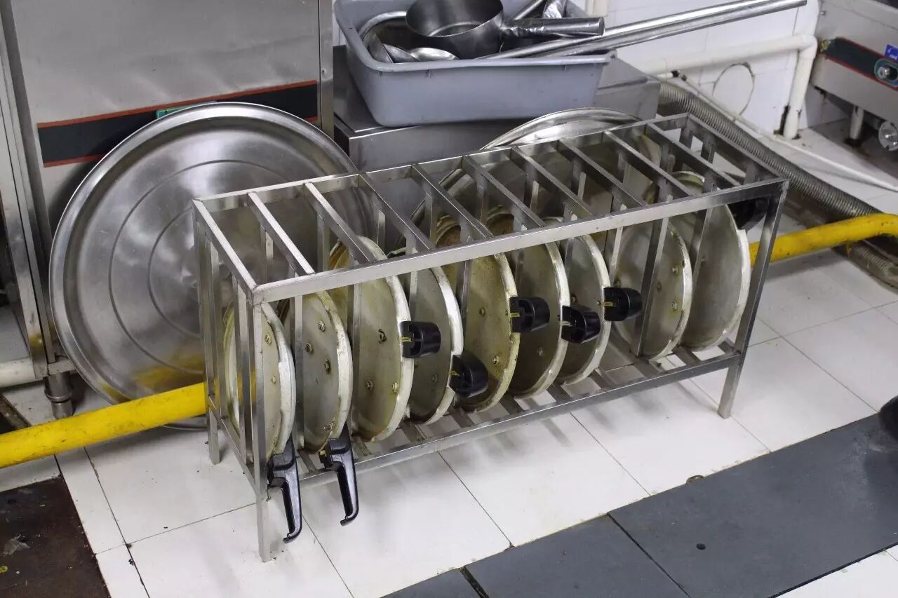 高压锅使用之后,盖子过热,放置在荷台上影响工作,随处放置又容易烫伤他人,为了解决这个问题,长沙徐记海鲜给这些锅盖开辟了一个集中的“住所”,锅盖被竖起,节省了空间,同时避免烫伤员工。