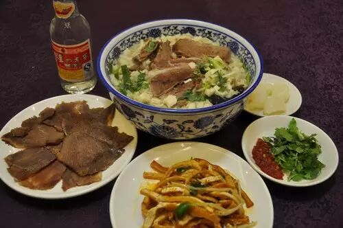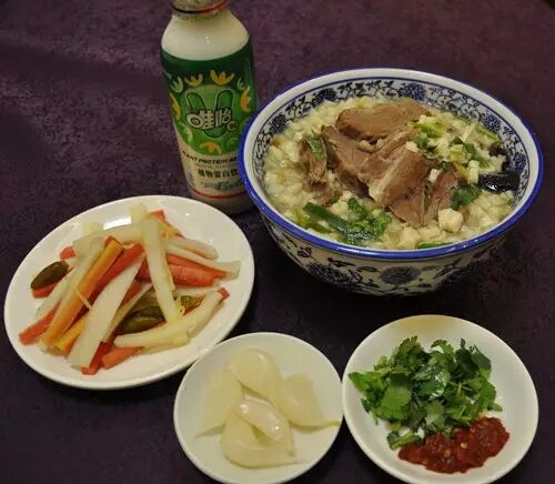 选自银川的优质羊肉,家传的手艺制作,汤清肉烂,香气诱人,噙在口中似有不同于流质的错觉,可谓满颊生香。食材的分量和质量绝对上乘,酱辣片和糖蒜也是用心调制的,能看出精细;泡馍的色泽光亮,暖胃耐饥,小编捞完干货,忍不住吧汤渣都喝光了~