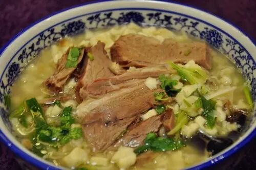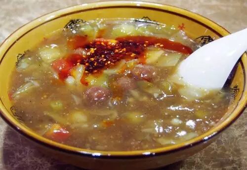河南胡辣汤遍及的大宝鸡,终于有了正宗的回民清真小吃——肉丸胡辣汤,牛羊骨熬汤,里面有浑圆的牛肉丸子、切成块状 的土豆、莲花白、胡萝卜、菜花、芹菜等。吃前浇一勺店家精心熬制的红艳艳的辣椒油,吃罢舌尖发麻(花椒惹得祸),微微冒汗,一整天都舒坦滴很~