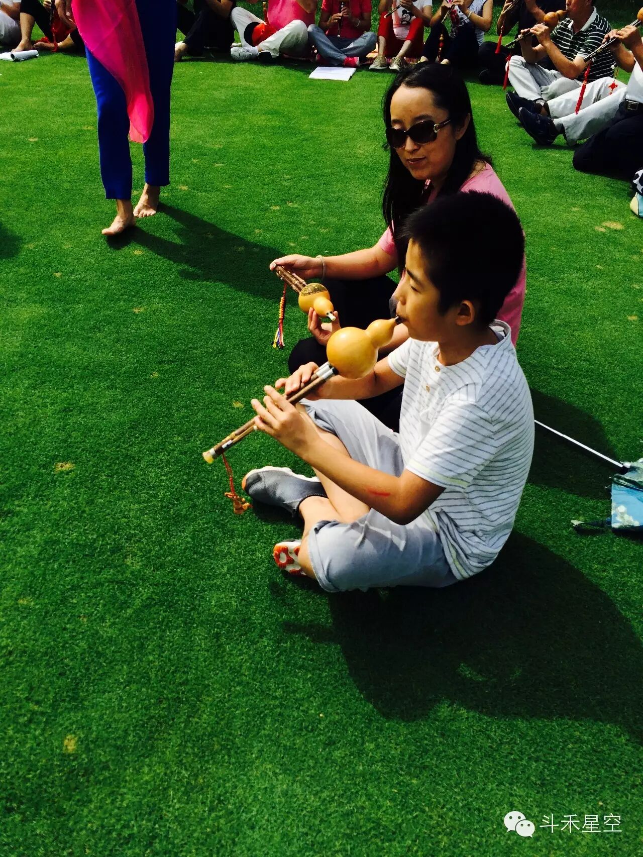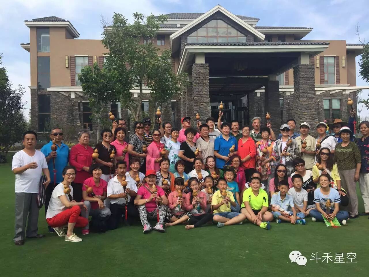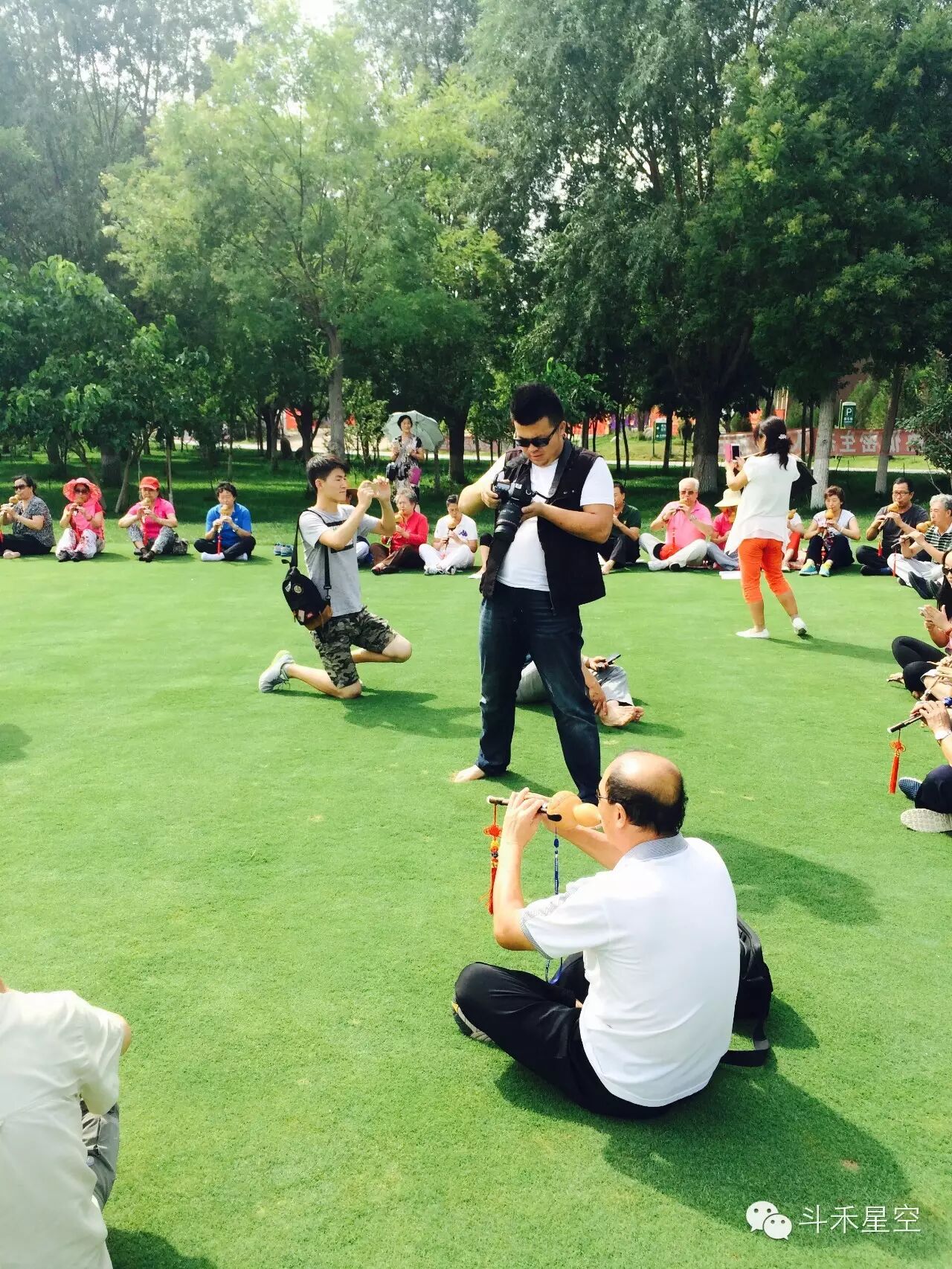 美餐后,还有重头戏,各位演奏家、学员们一起在颐和外商活动中心正门口的稀缺草坪上(草种可是高尔夫果岭草,外国引进的稀缺草种,俗称“绿黄金”)开始了群体演奏葫芦丝,那场面正是醉人!