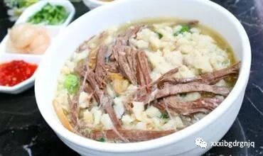 牛羊肉泡馍古称“羊羹”,宋代苏轼有 “陇馔有熊腊,秦烹唯羊羹”的诗句,其特点是料重味醇,汤鲜味浓,馍筋爽滑,香气四溢,诱人食欲,是一味难得的高级滋补佳品哦。羊肉泡馍的烹饪技术要求很严,煮肉的工艺也特别讲究。与肉合烹的“托托馍”酥脆甘香,入汤不散。用餐之前,须把“托托馍”掰成碎块。掰馍讲究越小越好,这是为了便于五味入馍。然后 再由烹饪师烹调,煮馍讲究以馍定汤,调料恰当,武火急煮,适时装碗,以达到原汤入馍,馍香扑鼻的要求。