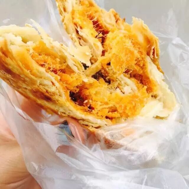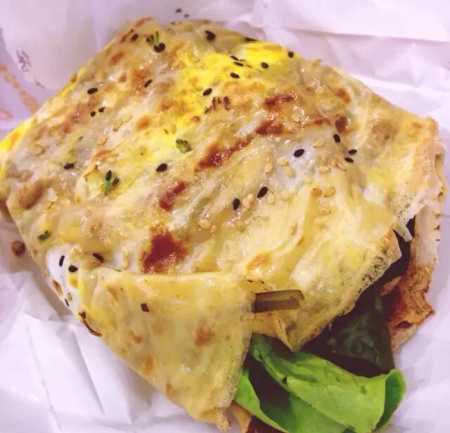 这家煎饼最能脱颖而出的地方便是它的饼皮,独具匠心的撒上香香的黑芝麻使得整个煎饼香味更加浓烈。里面的料可以自己随意挑选,肉松、鸡柳等肉类配上海带丝、胡萝卜丝等蔬菜,营养都够啦。吃在嘴里口感很清爽,吃完一个就饱饱啦~