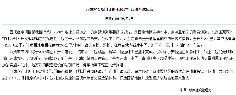 西成客专计划2017年5月1日静态验收,7月1日联调联试,年底通车试运营,用一句话概括——川陕两个吃货大省即将胜利会师,从西安到成都以后只需要不到3小时!