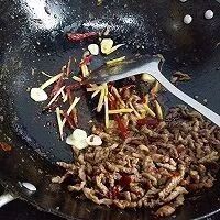 5. 把牛肉丝扒到锅边,下姜蒜干尖椒丝炒香。