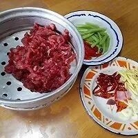 1. 牛里脊肉洗净沥干水,斜纹路切粗丝。红椒去籽切细丝,香芹去叶切合适小段。姜切丝,蒜切片,干尖椒用剪刀剪开去籽剪成细长段。