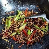 6. 大火一起翻炒,下入红椒丝继续翻炒,同时尝一下咸度是否放盐,我放了豆瓣酱一般没放盐。