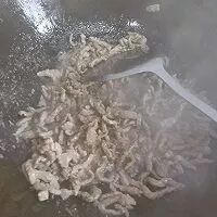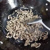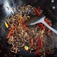 3. 牛肉丝出水后,把火开中小状态,用锅铲把牛肉丝不断煸炒。