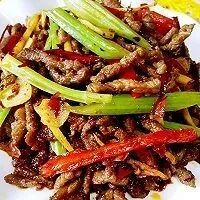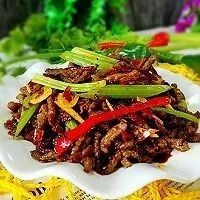 牛里脊肉干煸鲜嫩,也可以用牛腿肉等没筋膜的肉;干煸如果顺纹路切,炒出来咬不动,如果逆纹路切,炒出来成一包渣,要斜着纹路切。喜欢麻辣味的可以酌量加些花椒。
