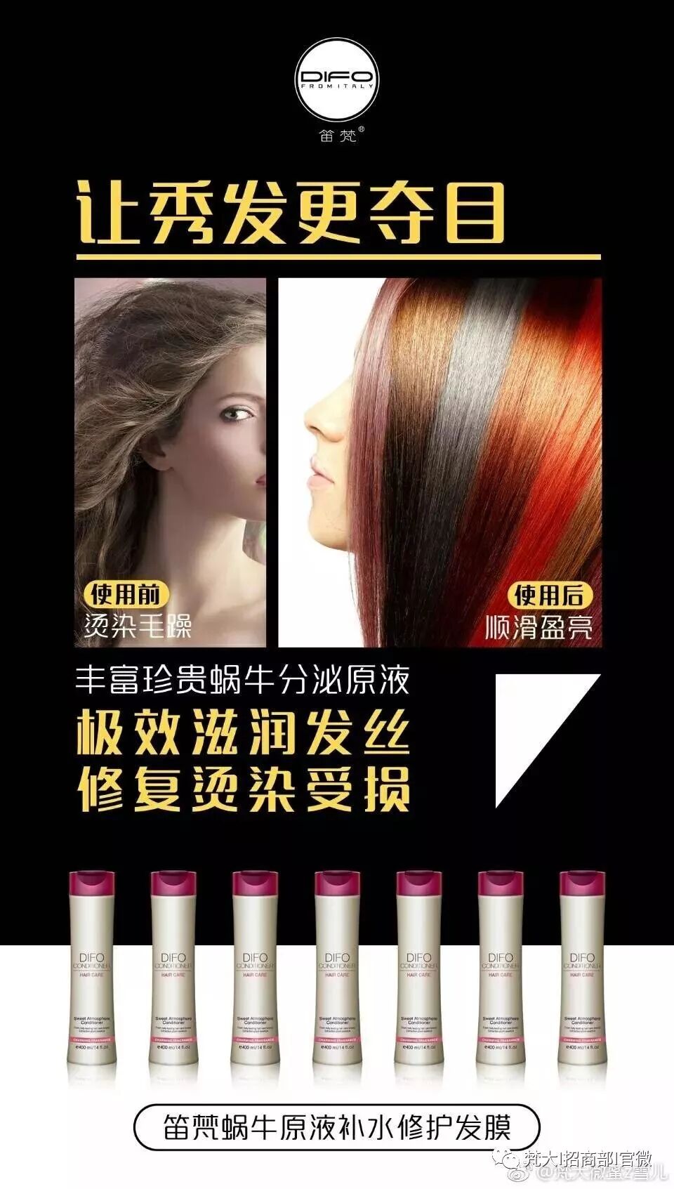 笛梵发膜采用美容补水佳品——蜗牛分泌物滤液、修护圣品蚕丝胶蛋白、水解胶原、氨基酸与水快速分解对头发有益的营养成分。使用笛梵发膜能排除头发烫染残留物及有害物质,平复发丝鳞状表层,形成锁水屏障,针对受损、毛躁、干枯发质有明显的修护、补水效果,修护受损发质,受损10度发质一次即可修护2-3度。笛梵发膜让秀发柔、软、轻、亮、顺。