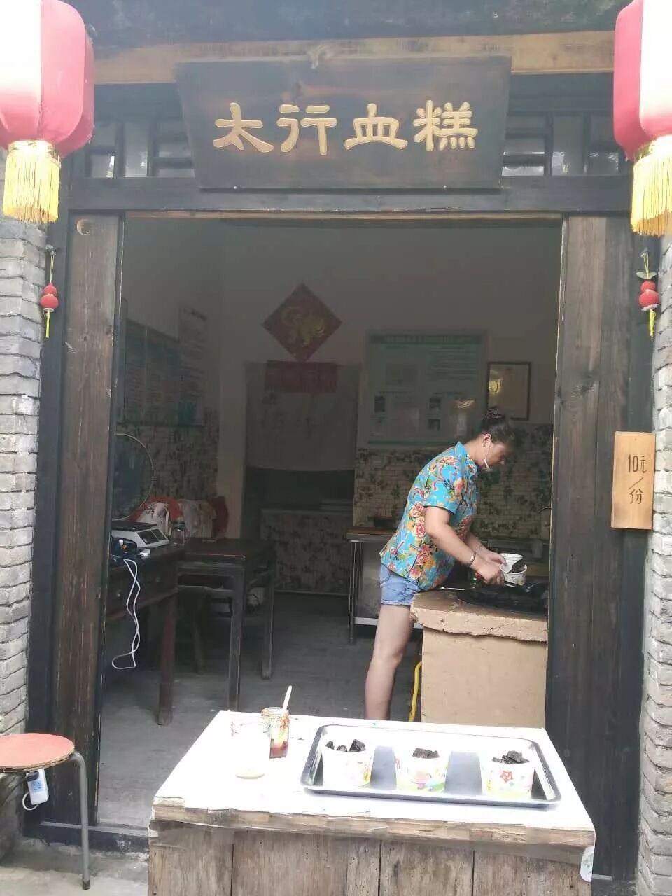 特点:血糕是太行山区传统的汉族小吃,始于清乾隆年间,用荞面,杂粮,干菜,鲜肉,猪血加调料蒸制而成,没有任何添加剂,属绿色手工食品,食时切片油炸,抹上蒜泥,香辣鲜美。太行血糕营养丰富,酥香适口,味道鲜美,经济实惠,风味独特,是补血,补铁,清肺,排毒之佳品,深受当地群众和外地游客的欢迎。