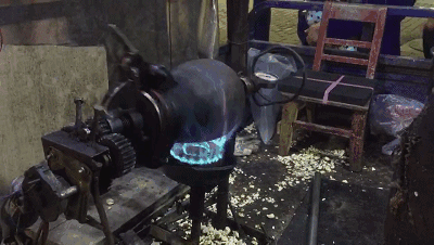 这个是手摇鼓风机。左手转着“铁葫芦”,右手摇着鼓风机,一刻都不能停,老爷爷说:停下了米花就糊掉了,就不好吃了。风从圆柱上的孔钻进去,钻进米花里,经过高温的炙烤,和米花一起形成了原始而又简单的美味。