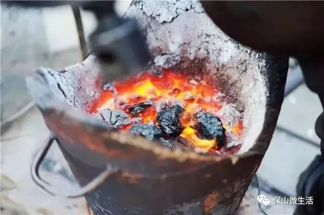 和爆米花机器配套的小火炉,里面的炭火已经烧起来了,又红又亮。