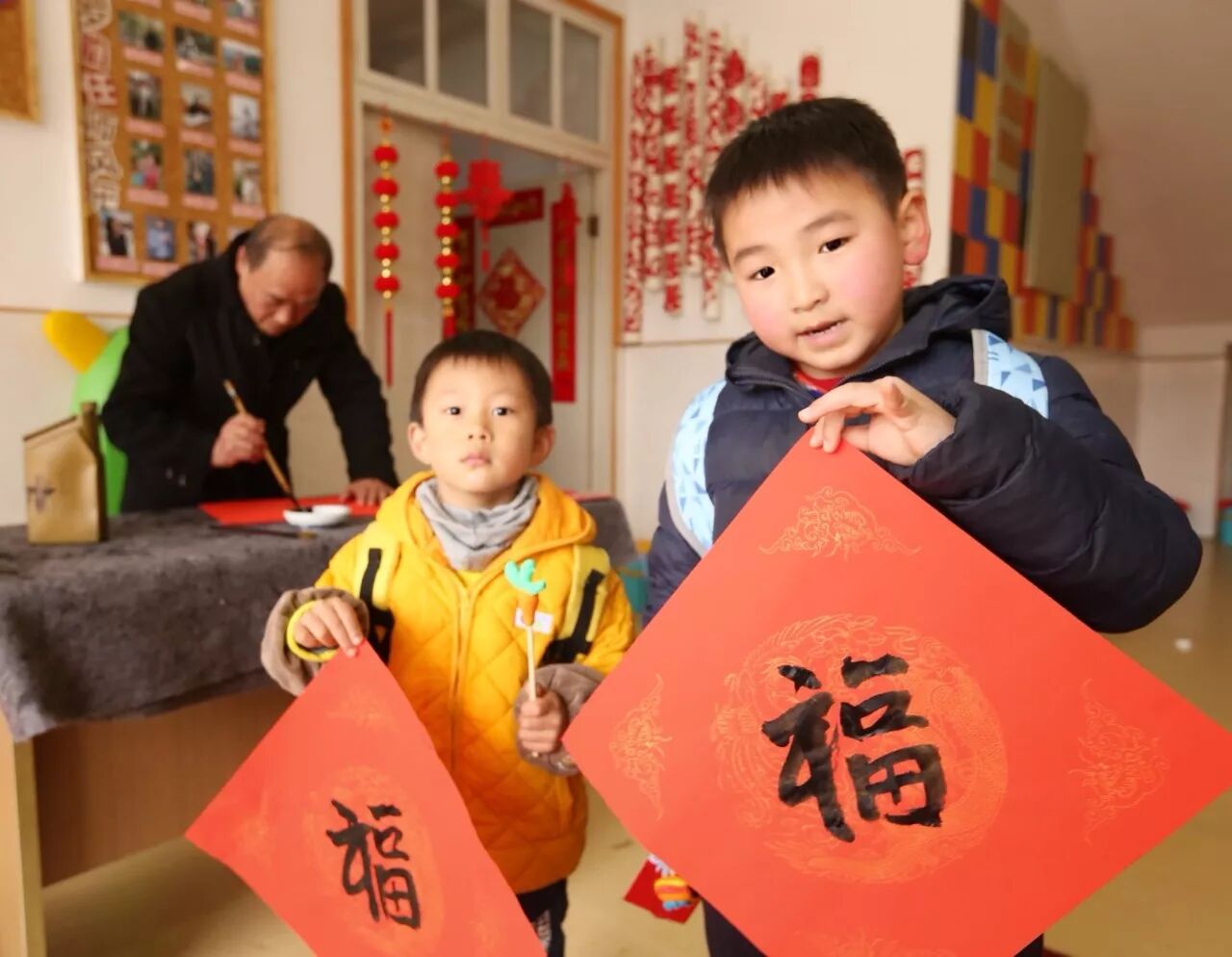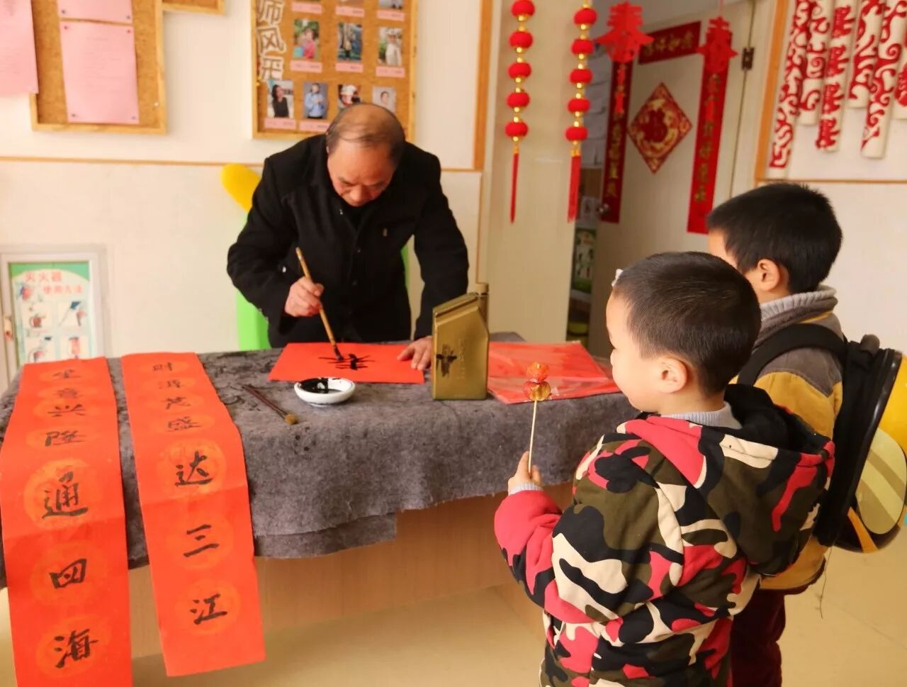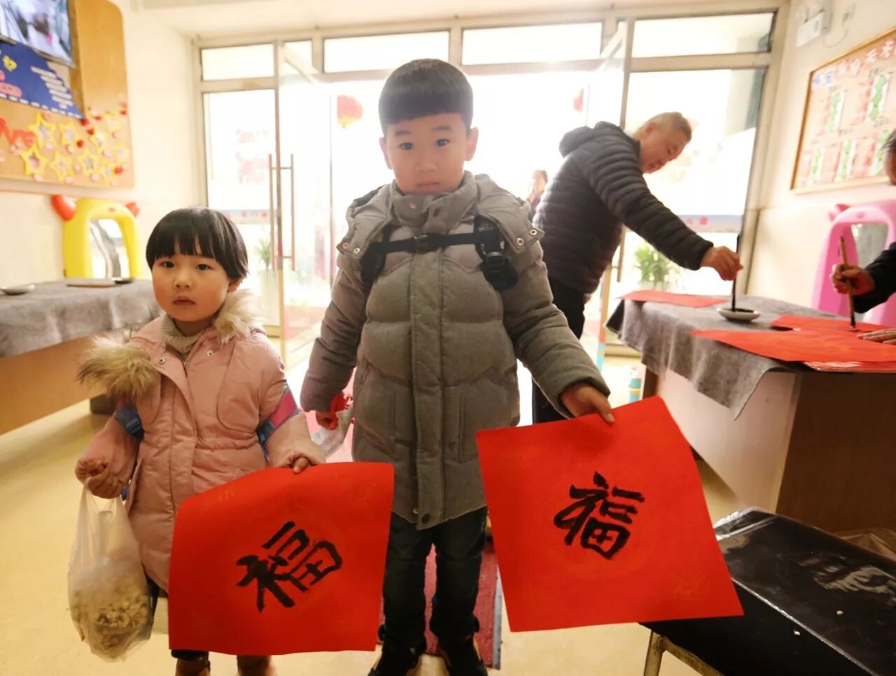 写春联、送春联、挂春联是我国的文化传统,与中国书法艺术紧紧相连。大一班的裘嘉宸爷爷和颜开民外公怀着对书画的热爱和对小朋友的美好祝福,气沉丹田,笔走龙蛇,泼墨挥毫,不一会儿,一幅幅散发着清新墨香的喜庆大红“福”、“春”字就展现在大家眼前。收到爷爷、外公赠送的“福”、“春”,大家乐开了怀!