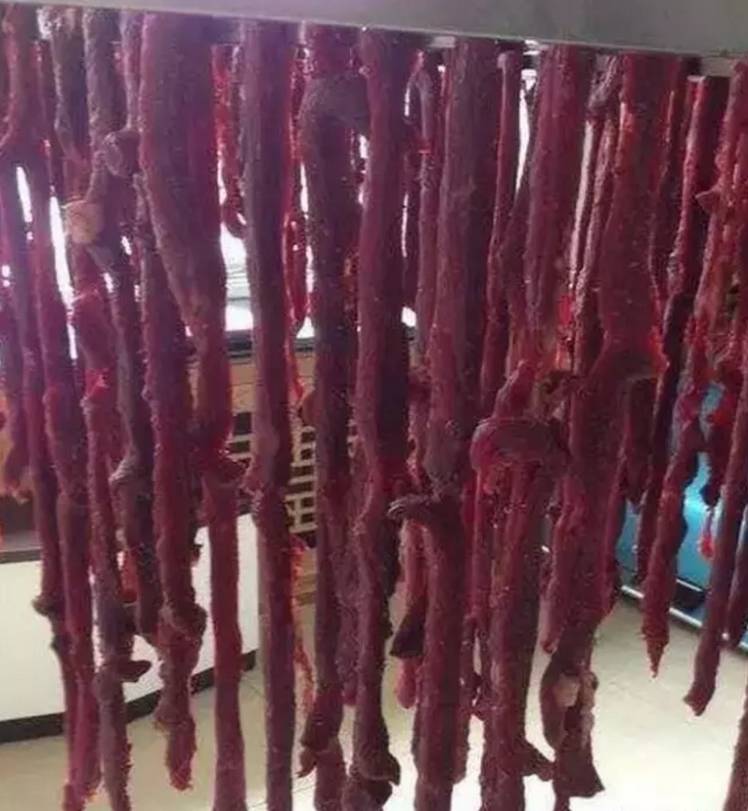 4:腌制12小时后将肉挂晒在自制的架子上,放在阴凉通风地方,然后进行风干晾制。根据地区和季节空气干燥程度不同,3至5天可以使用。因为内蒙古特殊的地理环境,气候干燥,风干时间可以少些所以易于晾制。