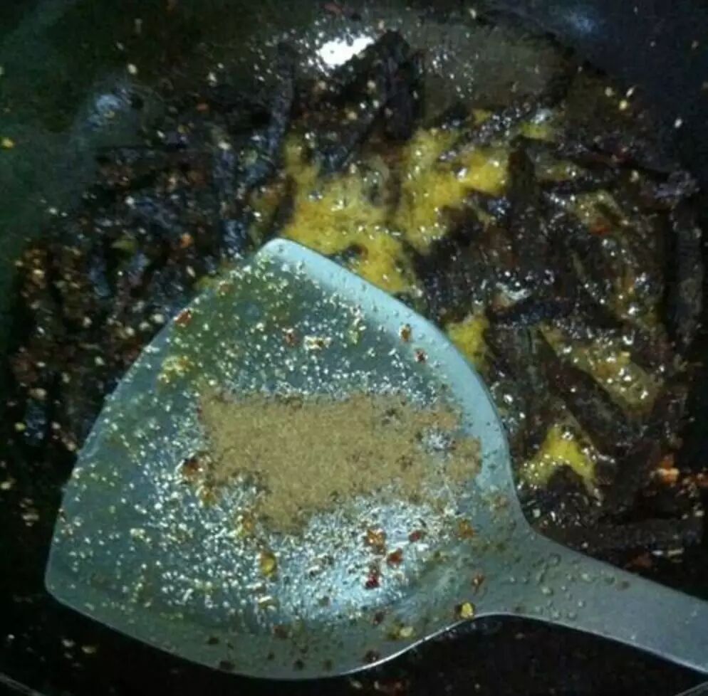 4、加干辣椒,炒炒炒,加姜粉,炒,