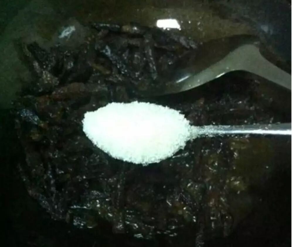 11再把牛肉倒进入,放白糖。不吃甜味的就加一勺调味,没那么干辣,喜欢甜一点的就多放点白糖,外面卖的就觉得太甜了,吃不习惯