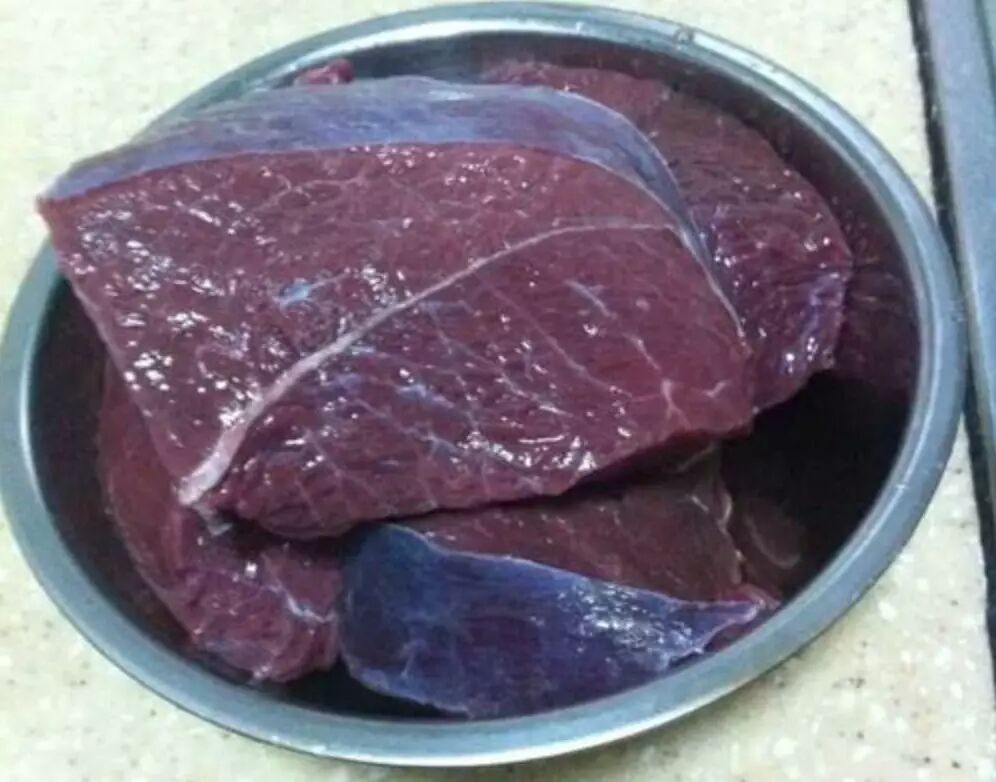 1、选用鲜肥壮牛前、后腿肉为佳,剔除脂肪和筋腱等,洗净、沥干,切成0.2-0.3公斤大小的肉块。