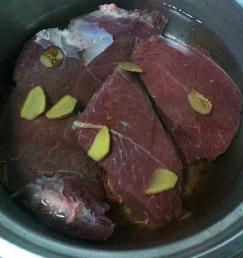 2把牛肉放锅里加适量的水放几片姜, 煮几分钟去血水