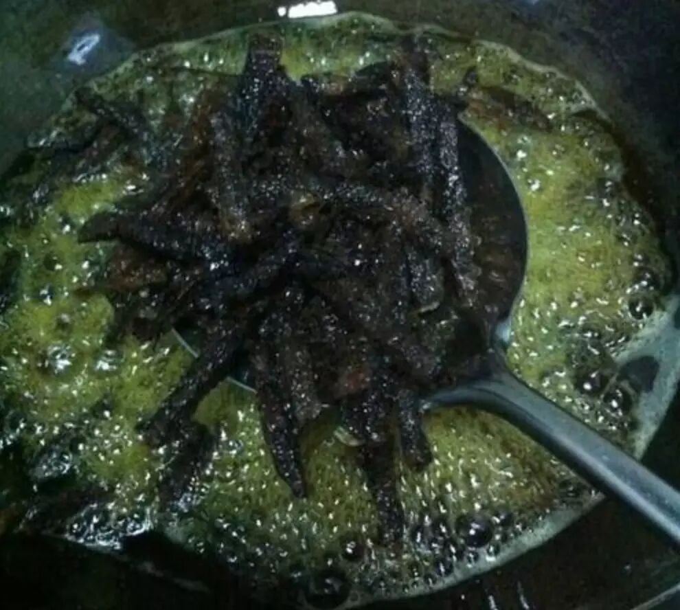 9小火慢慢炸干,一定要小火,不要心急,我这好像就好点过火了