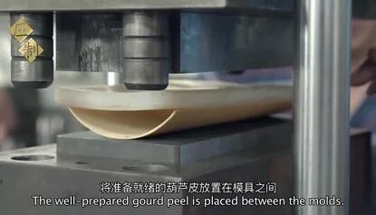 将准备就绪的葫芦皮放置在模具之间,通过千斤顶的压力,让钢模在一块植物的表皮上留下印迹。所有人都在等待,这是整整一年的期盼。