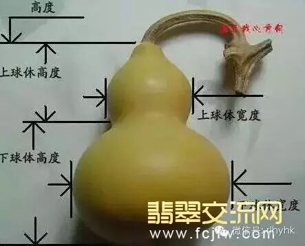 常见的翡翠葫芦高度大致为30~10mm,在知道高度的情形下,非常容易计算出上球形及下球形的高度。根据葫芦标准化形制的定义,因组成葫芦的部份是二个球形,因而可以推知:上球形高度=上球形宽度,下球形高度=下球形宽度。这是理想化形制,实际上实物稍有偏差,即不是标准的球形,以单个球形鉴赏,宽度稍大于高度更具美感。