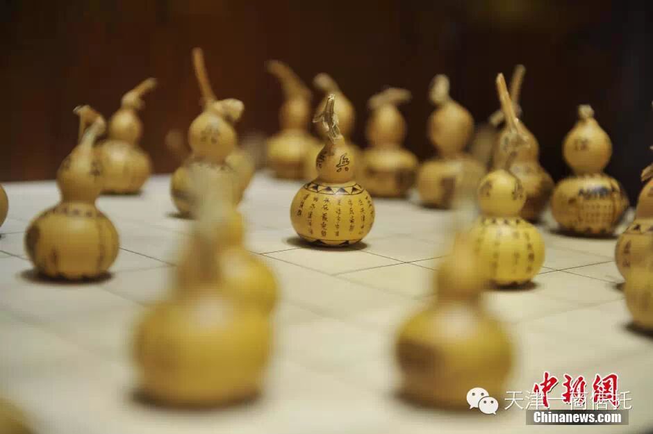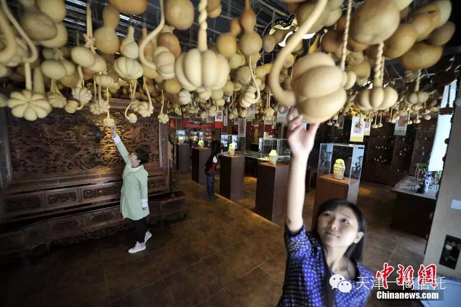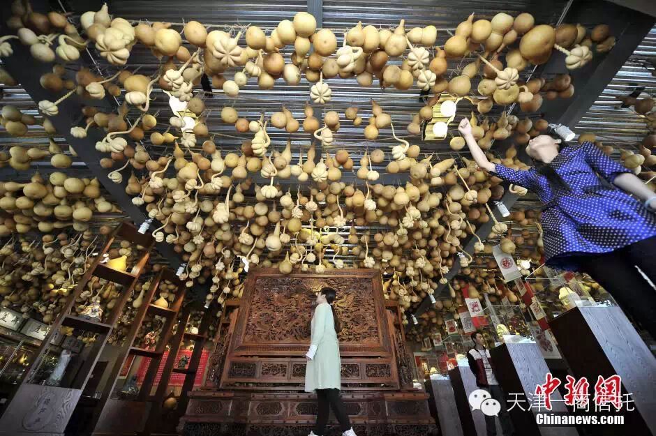 5月13日,游客在观看琳琅满目的葫芦。近日,天津首家葫芦博物馆“葫芦庐艺术馆”落成并免费对市民开放。据悉,约500平方米的葫芦博物馆,由天津非物质文化遗产“葫芦庐”第四代传人赵伟创办,馆内展示了18000多个形式各异的烙画、雕刻、范制、葫芦酒等工艺的葫芦制品,尽展中国葫芦艺术的魅力。同时,参观者还可体验烙画、彩绘、雕刻等葫芦制作技艺,感受博大精深的葫芦文化。中新社发