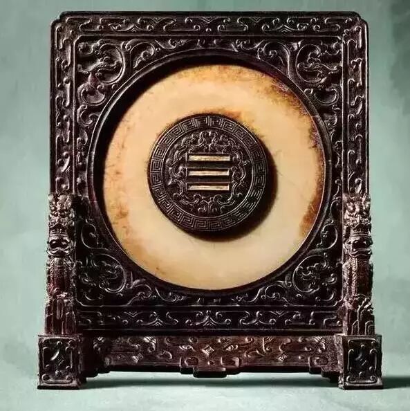 乾隆御制紫檀木嵌素古玉璧御题诗插屏