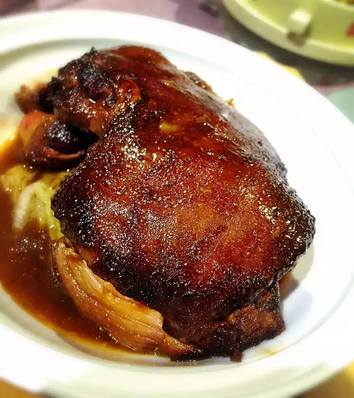 “精选猪肘,先煨制7个小时,油脂已经荡然无存;然后用老汤小火炖制5个小时,再去火泡上17个小时;薄薄的肘皮,用筷子头就能轻易划开,瘦肉软烂多汁……没就米饭,我吃了一半……”