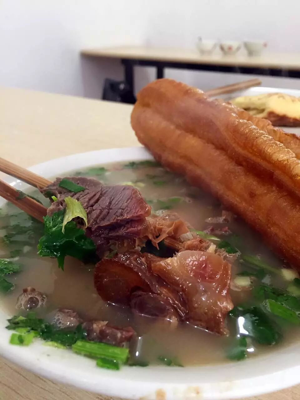 “剑南牛肉汤,牛筋牛肉牛肚,满满一大碗,泡着烧饼和油条,扬州人最爱的早饭。”