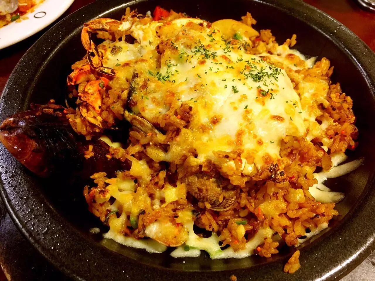 “以为是家普通韩餐,其实是韩式风格的西餐。海鲜芝士焗饭简直太良心,满满的海鲜,螃蟹、青口贝、大虾,最惊喜的是鱼籽,混在粒粒分明饱满的米粒里面,口感丰富;芝士也很舍得放啊,特别浓郁的芝士香!连吃两碗完全不在话下。对了,还有这家店的服务员都是又帅又温柔的韩国欧巴哦,各位姐妹,只能帮你们到这儿了。”