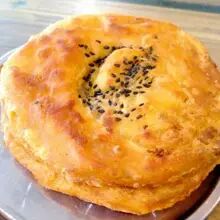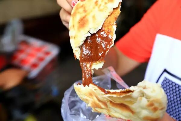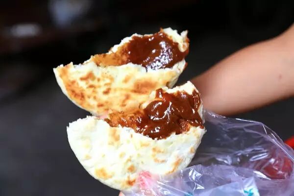 拿在手里还滚烫。锅盔面皮温软中带着小麦烤焦的香气,那是麦粉最原始质朴的甜香,轻轻撕开,里面粘稠的红糖暴露出来,带着甜蜜的香气。外皮口感有嚼劲,内里柔和松软,没有面粉改良剂或添加剂的存在,一切都是传统的味道。由于太美味,吃着吃着都忘记给邱二哥钱了,等我走出几百米外才想起,屁颠屁颠的跑回去给钱,邱二哥边找钱边说:唉呀一个锅盔,请你吃都可以。