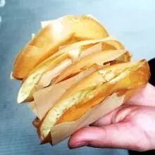 老地方的老板是一对老夫妻,大爷和婆婆现在头发都已花白,但是手脚利索,记性超好,哪怕你点再多蛋烘糕再多的味道,大爷都能一个不少的给你重复一遍。一般是婆婆“掌勺”,大爷负责给你点单和结账。婆婆烤烘糕的时候动作娴熟,却不失火候,每块蛋烘糕都是刚刚好,面皮香脆一咬就碎,里面棉糯柔软、混着鸡蛋的香味,加了不同口味的酱料后还会再烘一下,保证入味。